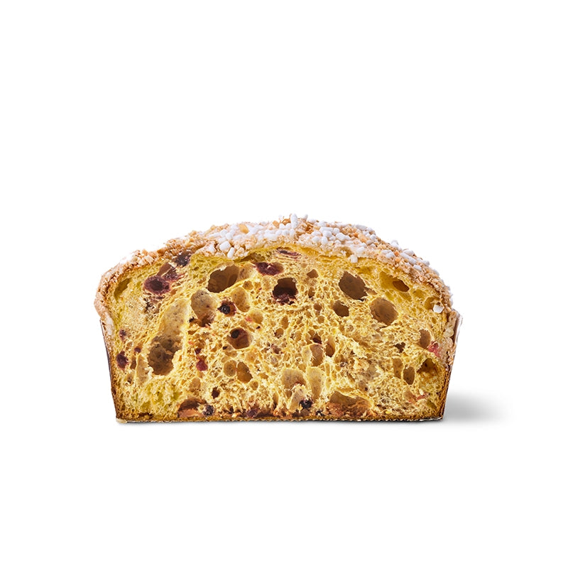 This leavened cake, made with a refreshing sourdough starter and cream butter, exudes a delicate, elegant, and pleasantly lively flavor. Inside, it features a blend of plump and juicy fruits—strawberries, raspberries, currants, and blueberries—that lend freshness and a pleasant tartness, perfectly balanced with the sweetness of the dough and the aroma of Madagascar Bourbon vanilla. It's topped with a crunchy sugar and chopped almonds.